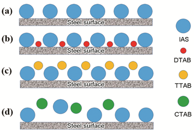 LCO2/H2S共存盐水溶液中IAS与3种表面活性剂在碳钢表面的成膜机理示意图