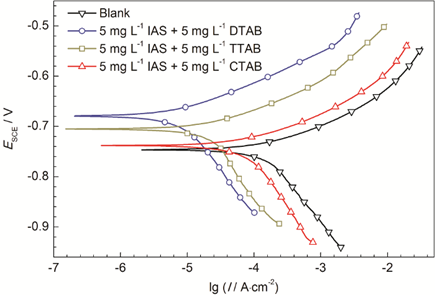 Q235钢在含有不同缓蚀剂的CO2/H2S共存盐水溶液中测得的极化曲线