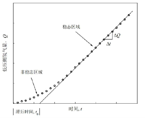 当一个高压差作用在两侧不同浓度的氢气体系上时,氢分子将会沿着浓度梯度从高浓度向低浓度方向扩散,同时穿过渗透膜进入低压区域,最终导致渗透流量和压力差之间的关系。因此,通过测量渗透通道中的氢气流量以及对应的压力差,可以计算出材料的氢气渗透系数。